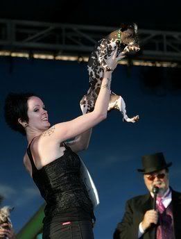 Miss Ellie celebrates her win in the World’s Ugliest Dog Contest’s pedigree class at the Sonoma-Marin Fair on Friday, June 26, 2009, in Petaluma, Calif. She is a blind 15-year-old Chinese Crested Hairless.