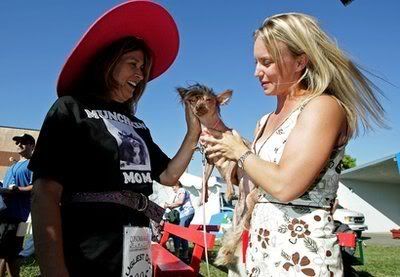 **FILE PHOTO** Rascal (L) a Chinese Crested dog meets Japanese Crested dog, Pee Wee Martini at the 2007 World’s Ugliest Dog Contest June 22, 2007 in Petaluma, California. Pee Wee Martini, like many dogs in the contest was saved by one of many animal rescue organizations found across the country.