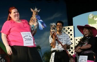 **FILE PHOTO** Heather Peoples of Phoenix, Arizona holds her Chinese Crested dog Archie after he was crowned the World’s Ugliest Dog at the 18th annual World’s Ugliest Dog competition June 23, 2006 at the Sonoma-Marin Fair in Petaluma, California.