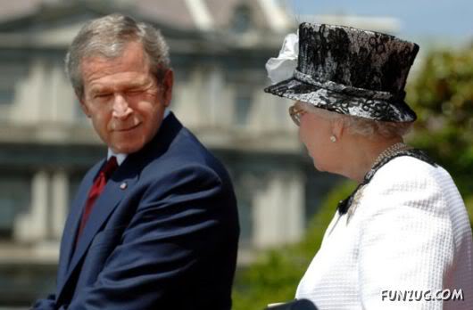 George W. Bush winks at Queen Elizabeth II while giving a speech at the White House during the British Royal State visit to Washington DC in 2007. As you do
